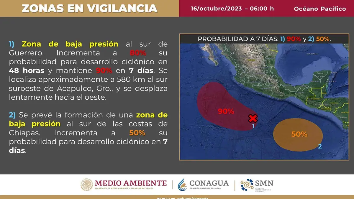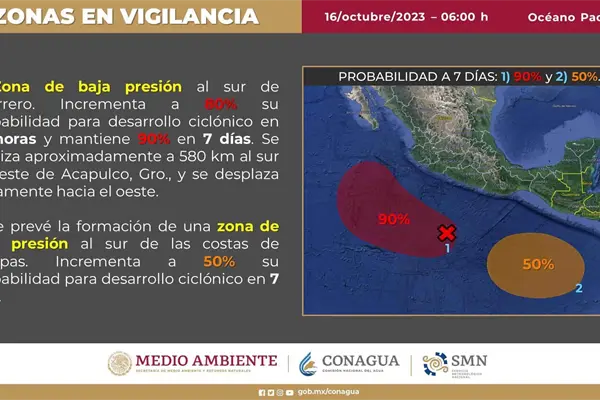 El Centro Nacional de Huracanes (CNH) vigila dos zonas con potencial ciclónico; la primera perturbación se ubica distante al sur de Guerrero cuyo movimiento sería al oeste, lejos del litoral del Pacífico, el cual se podría convertirse en ciclón entre martes o miércoles, llevando el nombre de «Norma».