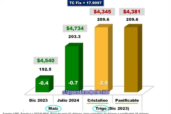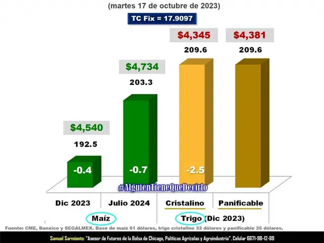 Por otro lado, los futuros de trigo con entrega en diciembre de 2023 también experimentaron una caída, perdiendo 2.5 dólares y estableciendo un precio de referencia de $4 mil 345 por tonelada de trigo cristalino y $4 mil 381 por tonelada de trigo panificable (considerando las BASES de 33 y 35 dólares propuestas por SEGALMEX para Sinaloa).
