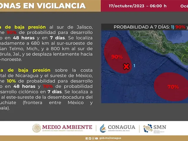 «Norma» está a unas horas de convertirse en ciclón tropical según los pronósticos del Servicio Meteorológico Nacional (SMN), pues este fenómeno meteorológico está al sur de Jalisco y mantiene 90% de probabilidad para desarrollo ciclónico en 48 horas y en 7 días.