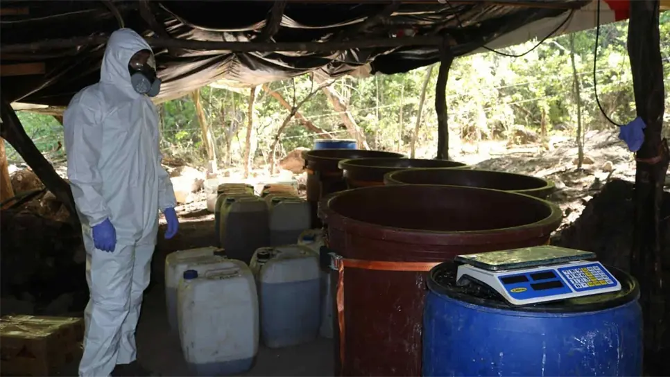 El mando militar comentó que este narcolaboratorio de metanfetamina ubicado en una zona escarpada y entre caminos estrechos de difícil acceso, cuenta con módulo de fabricación, cuatro áreas de almacenamiento, un área o campamento para al menos 25 personas, en donde vivían de manera permanente, por lo que se presume que se producía droga sintética día y noche.
