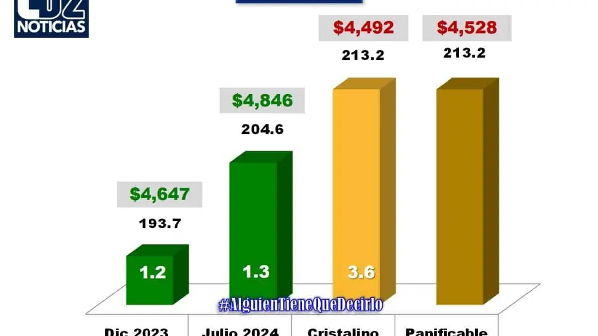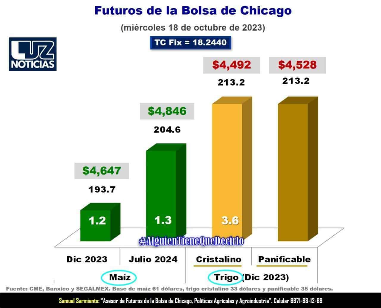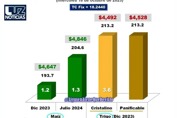 Por otro lado, los futuros de trigo a diciembre de 2023 experimentaron un incremento de 3.6 dólares, alcanzando los 213.2 dólares por tonelada, lo que significa un precio de referencia de $4 mil 492 por tonelada de trigo cristalino y $4,ñ mil 528 por tonelada de trigo panificable.