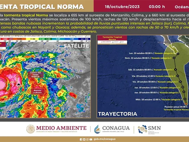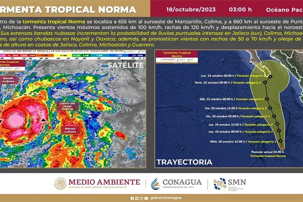 De acuerdo al SMN, la tormenta tropical «Norma» continúa disminuyendo su velocidad de desplazamiento al suroeste de las costas de Colima y Michoacán. Sus bandas nubosas incrementan la probabilidad de lluvias muy fuertes a intensas en el occidente y sur del país. Se pronostica que evolucione a huracán categoría 1 en las próximas horas.