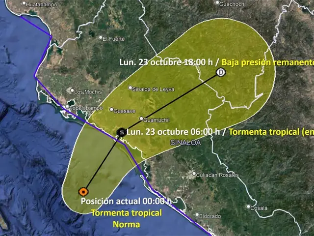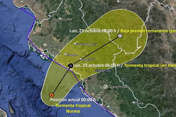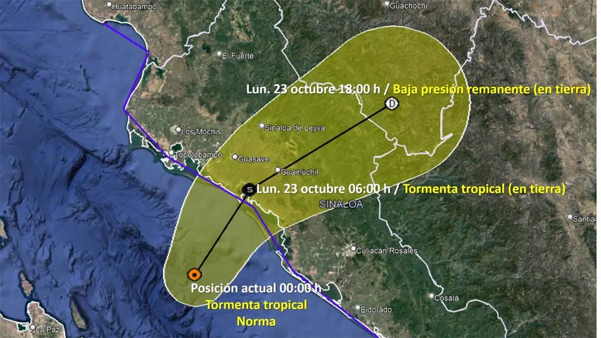 Se espera que la tormenta tropical Norma impacte al sur de Guasave entre las 02:00 y 05:00 horas de este lunes 23 de octubre.