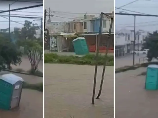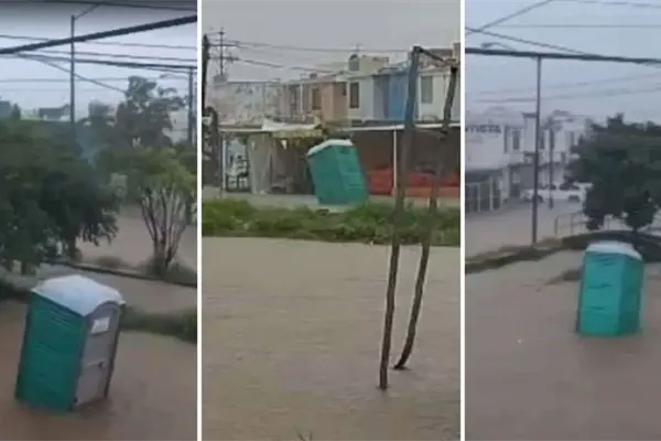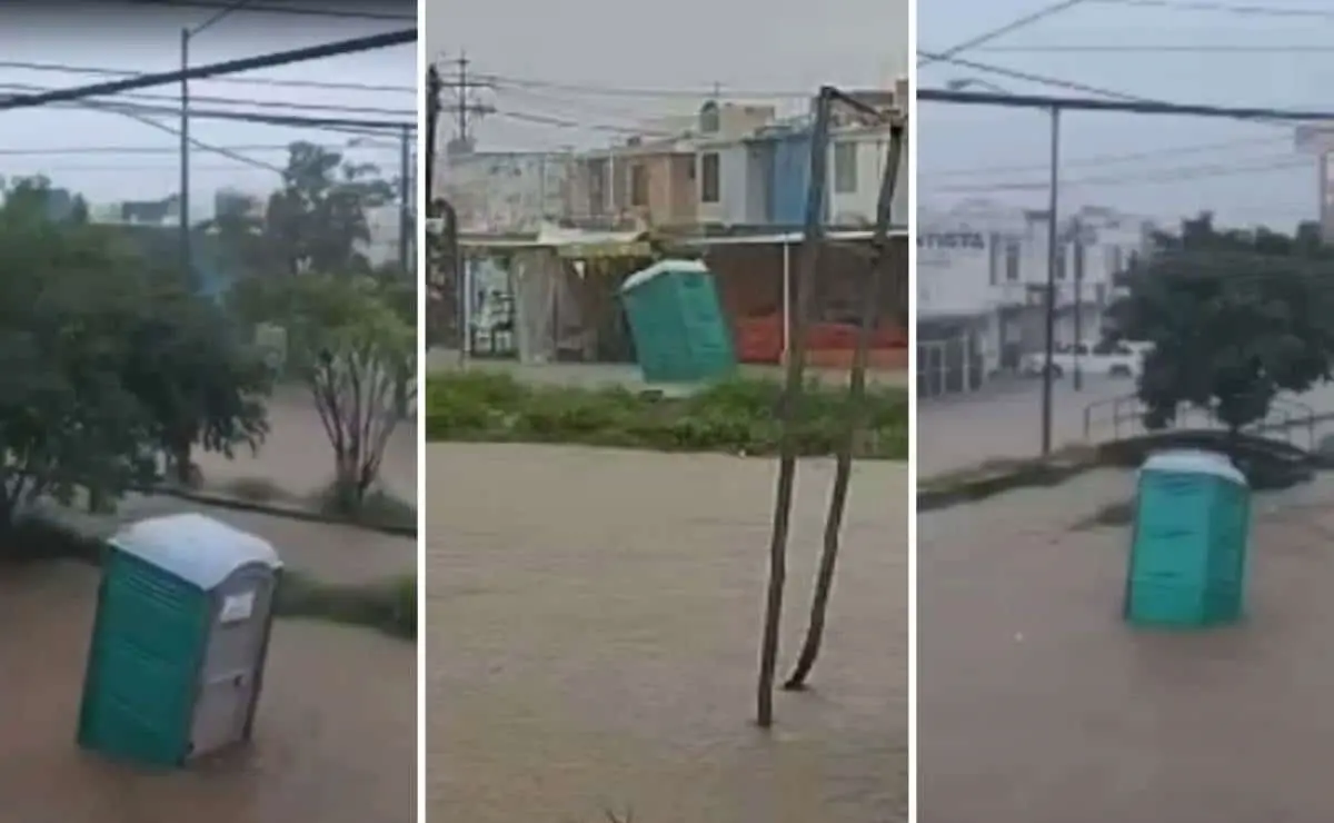 Y es que, tras las inundaciones, un «popo room» fue captado siendo arrastrado por el agua en el fraccionamiento Alarcón en el puerto, luego de que el agua subiera de manera importante en las calles.