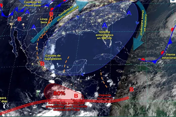 Además, se mantiene bajo vigilancia la formación de una zona de baja presión al suroeste de Baja California Sur, mantiene 20% de probabilidad para desarrollo ciclónico en 7 días.