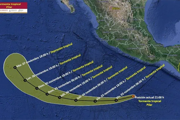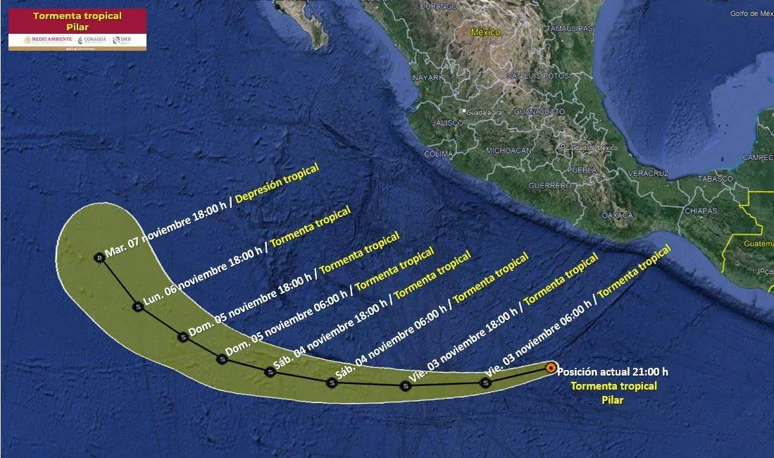 De acuerdo al último reporte del Servicio Meteorológico Nacional, el centro de la tormenta tropical Pilar se localiza frente a las costas de Oaxaca y Guerrero, a 630 km al sur de Punta Maldonado, Guerrero, y a 750 km al suroeste de Salina Cruz, Oaxaca.
