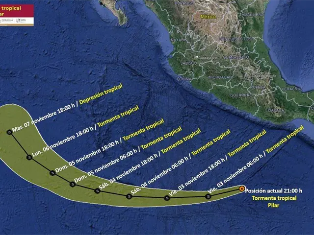 Pilar sigue un desplazamiento hacia el oeste-suroeste (250°) a 35 km/h; presenta vientos sostenidos de 95 km/h con rachas de 110 km/h y su circulación refuerza el potencial de lluvias en el sureste de México.