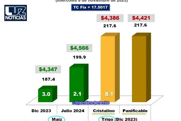 En el mismo escenario, los futuros de trigo a diciembre del 2023 experimentaron un notable aumento de 8.1 dólares, situándose en 217.6 dólares. Esto se traduce en un precio de referencia de $4 mil 386 por tonelada de trigo cristalino y $4 mil 421 por tonelada de trigo panificable (considerando las BASES de 33 y 35 dólares propuestas por SEGALMEX para Sinaloa).