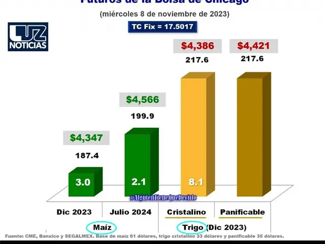 Este miércoles, los futuros de maíz para diciembre del 2023 ganaron 3 dólares, alcanzando los 187.4 dólares, con un precio de referencia de $4 mil 347 por tonelada (considerando la BASE de 61 dólares propuesta por SEGALMEX). Además, los futuros de maíz a julio del 2024 subieron 2.1 dólares, ubicándose en 199.9 dólares, equivalentes a $4 mil 566 por tonelada.