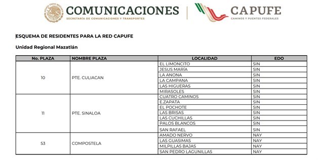 CAPUFE lo llama Programa de Residentes cuyo esquema tarifario lo aplica en 29 casetas de cobro del país, entre las que destacan dos puentes ubicados en el estado de Sinaloa, en específico en los municipios de Culiacán y Guasave.