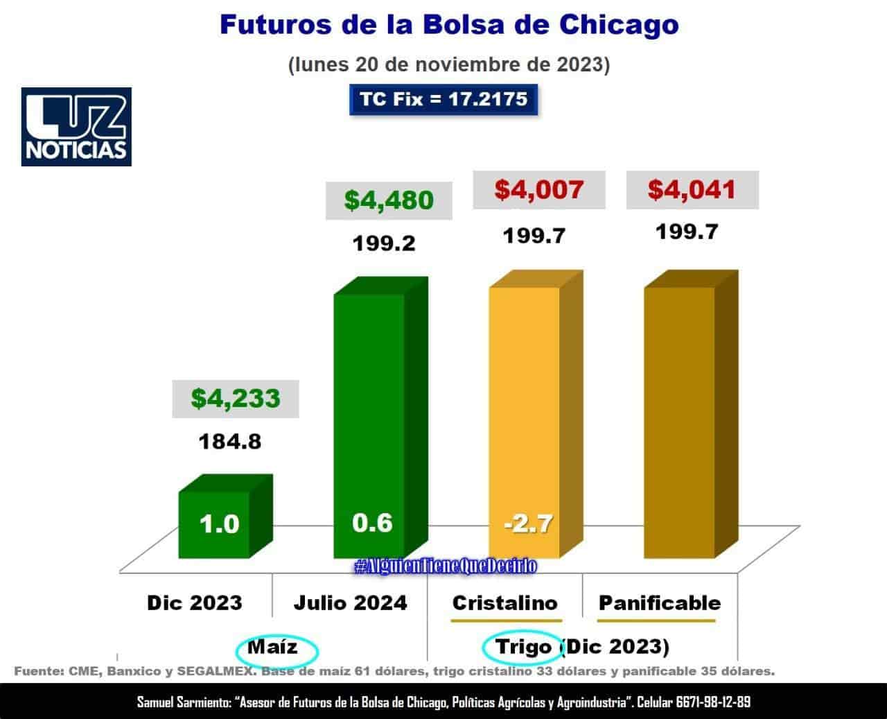 Por otra parte, los futuros de trigo a diciembre del 2023 perdieron 2.7 dólares para ubicarse en 199.7 dólares, lo que significa un precio de referencia de $4 mil 007 por tonelada de trigo cristalino y de $4 mil 041 por tonelada de trigo panificable (considerando las BASES de 33 y 35 dólares propuestos por SEGALMEX para Sinaloa).