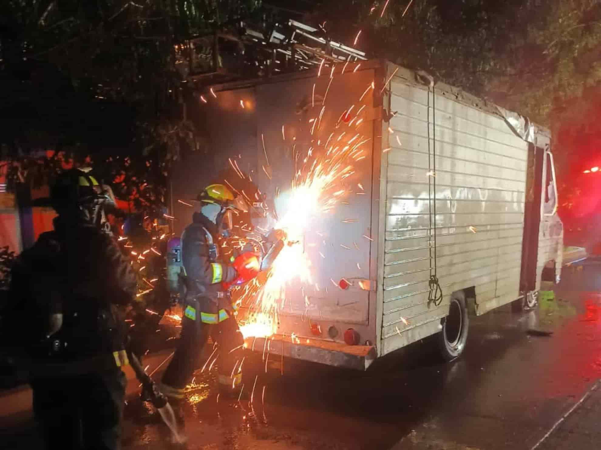 El incendio de un camión se registró durante te la tarde-noche de este lunes en la colonia Sánchez Celis, en Mazatlán; la unidad afectada es un camión Chevrolet cargado con equipo de sonido.