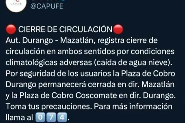 Por precaución y seguridad de los usuarios, se informa que la Plaza de cobro Durango, en dirección a Mazatlán, y la plaza de cobro Coscomate, en dirección a Durango, permanecerán cerradas, hasta que las condiciones climatológicas permitan su apertura.