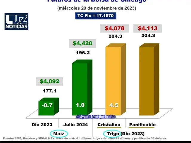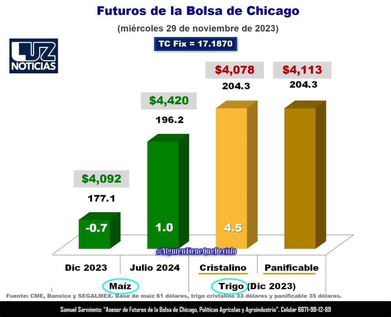 En este escenario, este miércoles, los futuros de maíz a diciembre del 2023 perdieron 0.7 dólares para ubicarse en 177.1 dólares, lo que significa un precio de referencia de $4 mil 092 por tonelada de maíz (considerando la BASE de 61 dólares propuesta por SEGALMEX), mientras que los futuros de maíz a julio del 2024 ganaron 1 dólar para ubicarse en 196.2 dólares, lo que representa un precio de $4 mil 420 por tonelada.