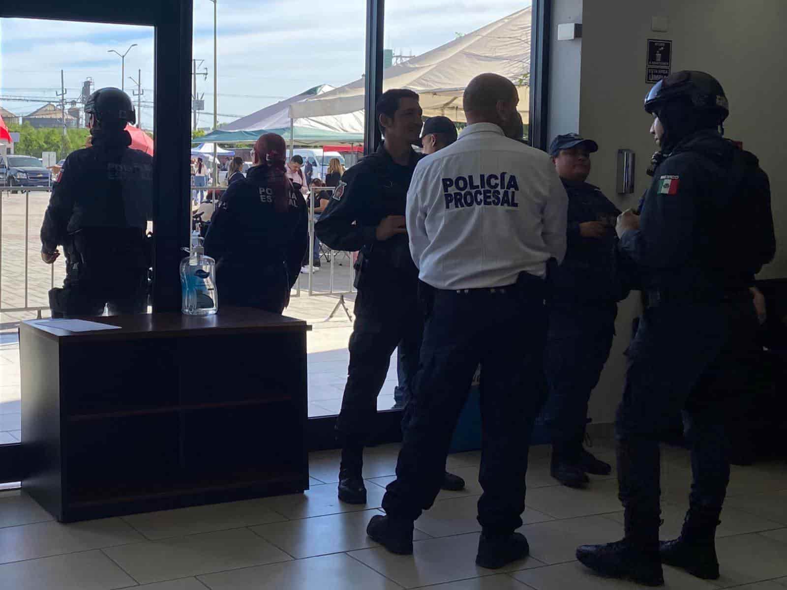 En ese momento el personal de la Fiscalía General del Estado quiso salir de la sala pero el público armó una barrera con sillas y les decían que no los dejarían salir hasta que el juez regresara, por lo qué policía Sebas procesales tuvieron que intervenir en la sala, alrededor de 10 elementos intentaron que se desalojara la sala pero el público no accedía, sin embargo el abogado Milton Ayala les pidió que los dejaran salir que el conflicto era con el juez.