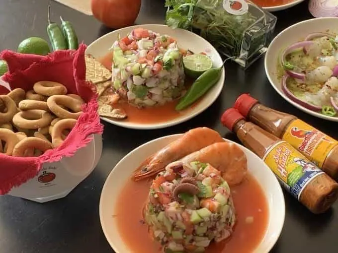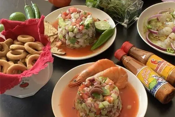 El establecimiento cuenta con el tradicional ceviche de pescado y camarón de litro y medio litro, cocteles, aguachiles y dulces como postre.