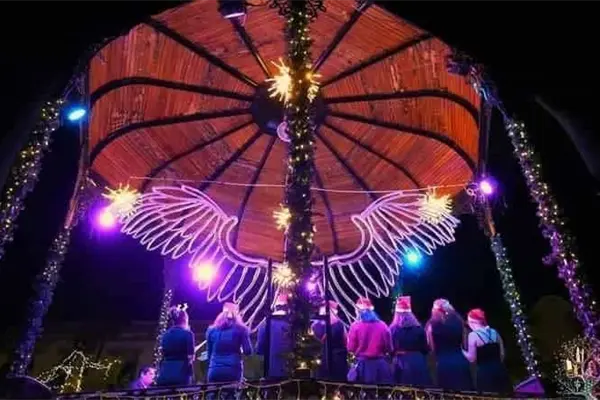 La plaza se convirtió en un gran jardín de invierno, adornado con miles de luces led, colores intensos y brillantes que adornarán la vegetación; además, cuenta con un parador donde los espectadores se podrán tomar fotografías bajo una aureola y alas de ángel luminosas.