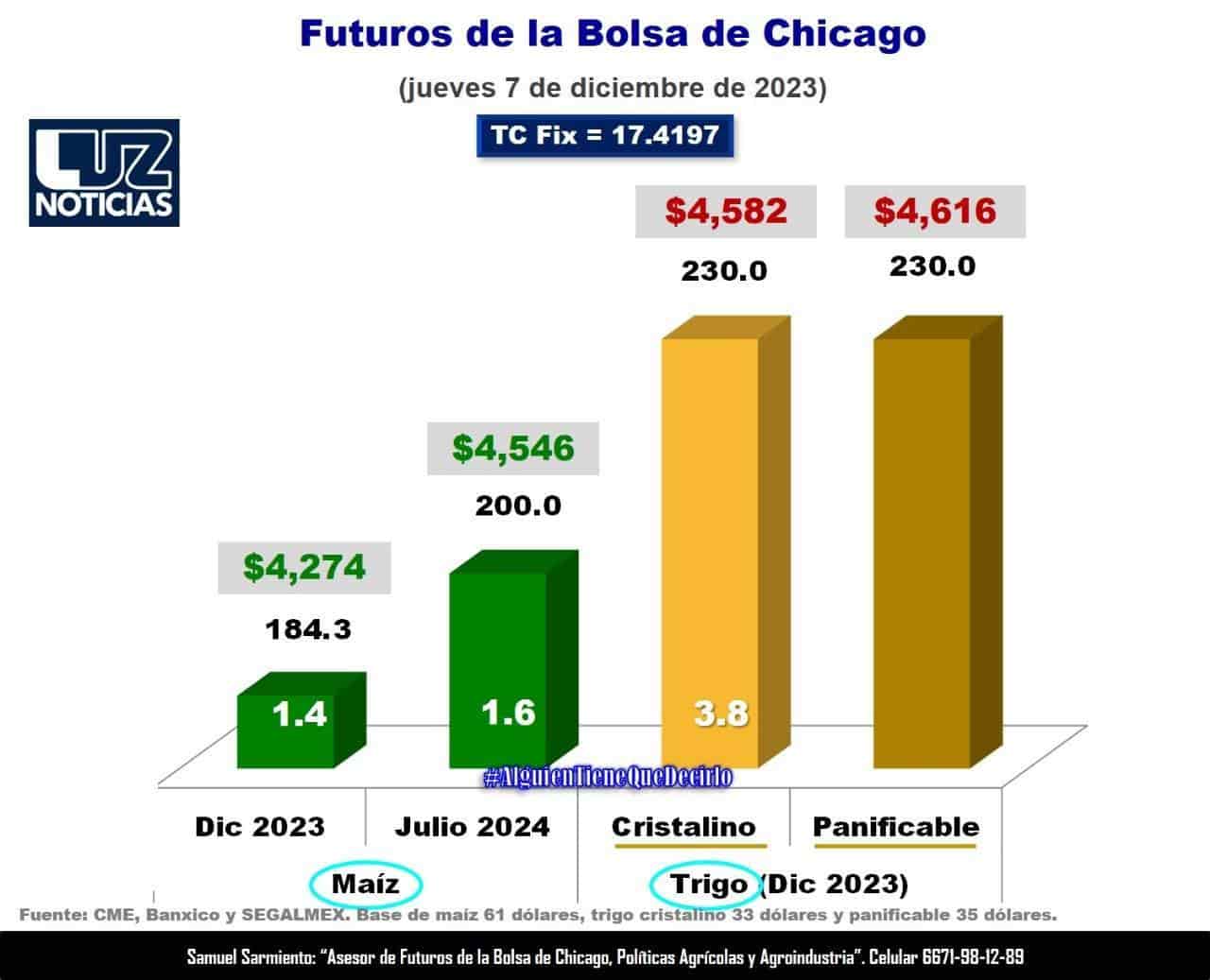 Por otra parte, los futuros de trigo a diciembre del 2023 ganaron 3.8 dólares para ubicarse en 230 dólares, lo que significa un precio de referencia de $4 mil 582 por tonelada de trigo cristalino y de $4 mil 616 por tonelada de trigo panificable (considerando las BASES de 33 y 35 dólares propuestos por SEGALMEX para Sinaloa).