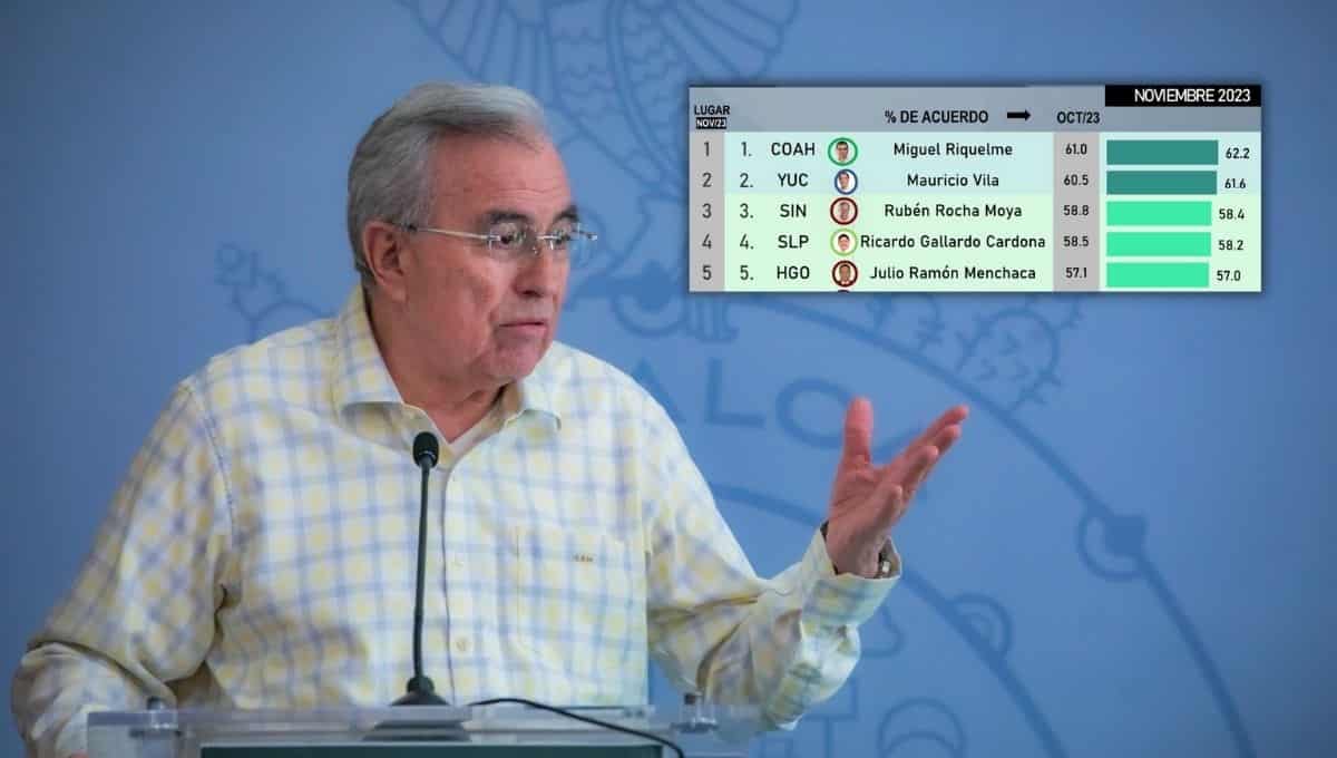 Con ello el gobernador sinaloense obtiene una calificación «sobresaliente», donde comparte el top tres con los gobernadores de Coahuila, Miguel Riquelme y de Yucatán, Mauricio Vila.