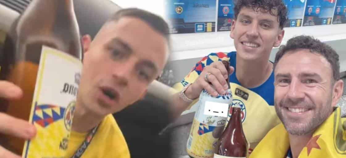 Varios jugadores del Américxa salieron del vestidor con caguama en mano tras ganar la 14