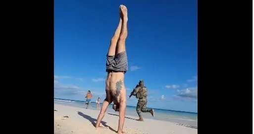 El hombre realizaba una postura de yoga, cuando captó el momento de una persecución, donde una persona sale corriendo a toda velocidad, seguido por dos soldados de la Marina.