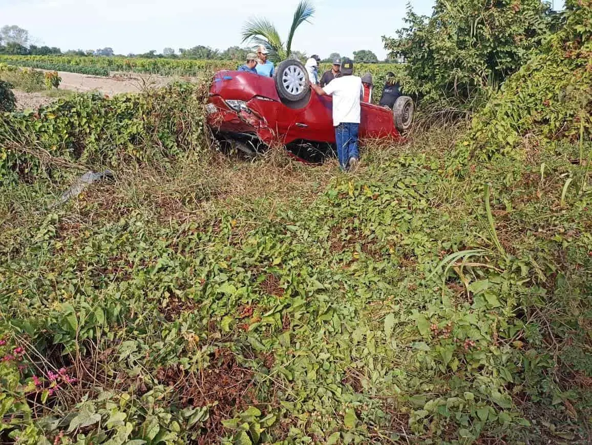 El suceso ocurrió cuando el automóvil impactó contra un bache en la carretera, llevando al conductor a perder el control de la unidad y volcar entre la maleza; afortunadamente, no hay decesos que lamentar.
