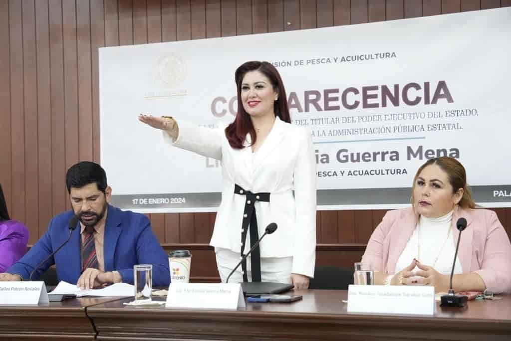 Comparece la Secretaria de Pesca y Acuacultura, Flor Emilia Guerra Mena frente a diputados del Congreso del Estado de la 64 legislatura en el marco del segundo informe de labores del gobernador Rubén Rocha Moya.