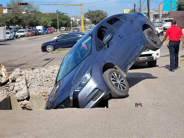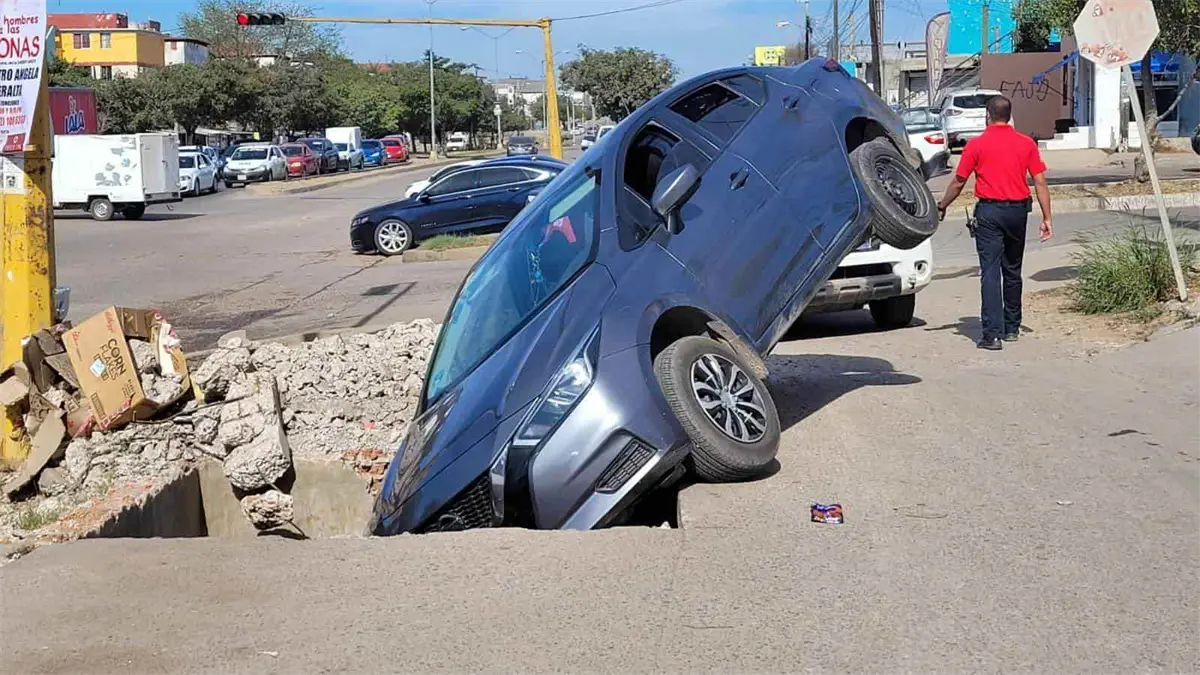 El conductor de un Nissan Versa de modelo reciente se quedó varado en la avenida Manuel J. Cloutier, en la colonia Flores Magón, donde se llevaban a cabo trabajos de reparación en una válvula de Jumapam.