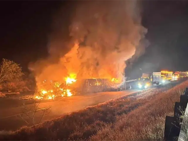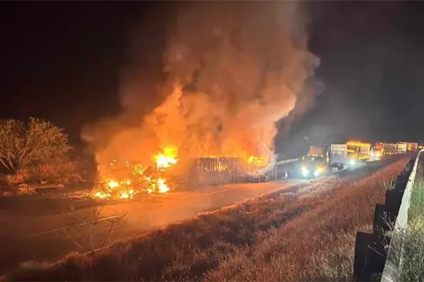 Esto provocó que terminara volcado sobre la carretera y parte del acotamiento; posteriormente, la unidad comenzó a incendiarse.