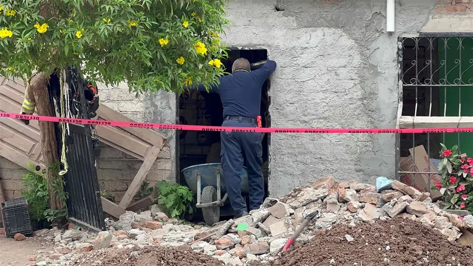 Personal de la Fiscalía General de Justicia del Estado realizan excavaciones en el interior de un domicilio ubicado al sur oriente de la ciudad de Los Mochis, en donde horas antes localizaron restos humanos presuntamente de una mujer, quien hoy se sabe tiene más de 10 años desaparecida.