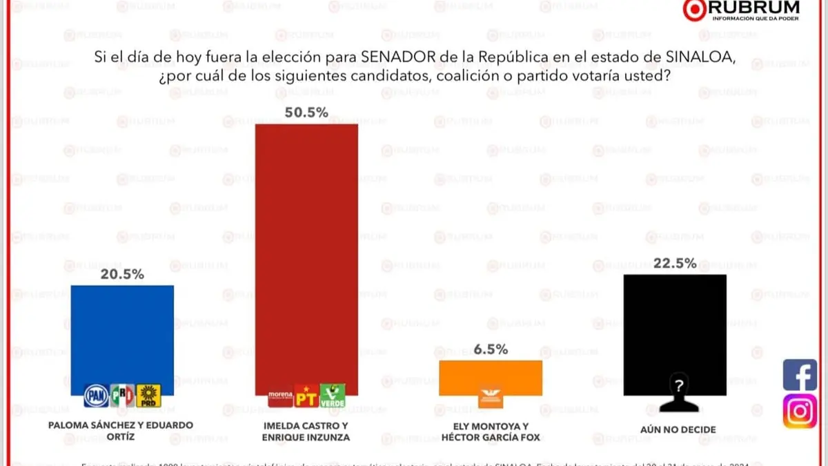 Enrique Inzunza Cazarez e Imelda Castro arrasan en la encuesta al Senado de la República en Sinaloa con el 50.5%, según la casa encuestadora RUBRUM.