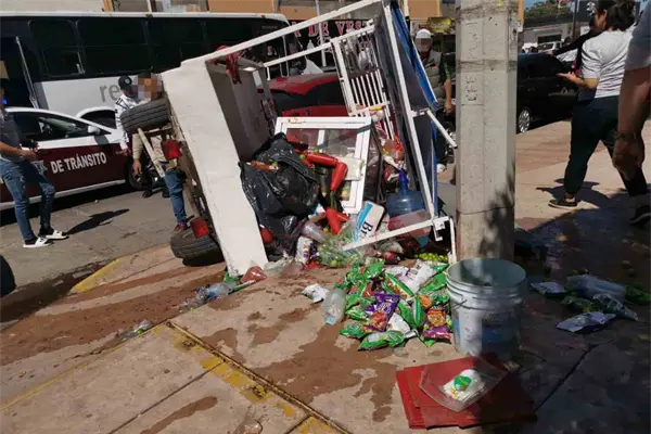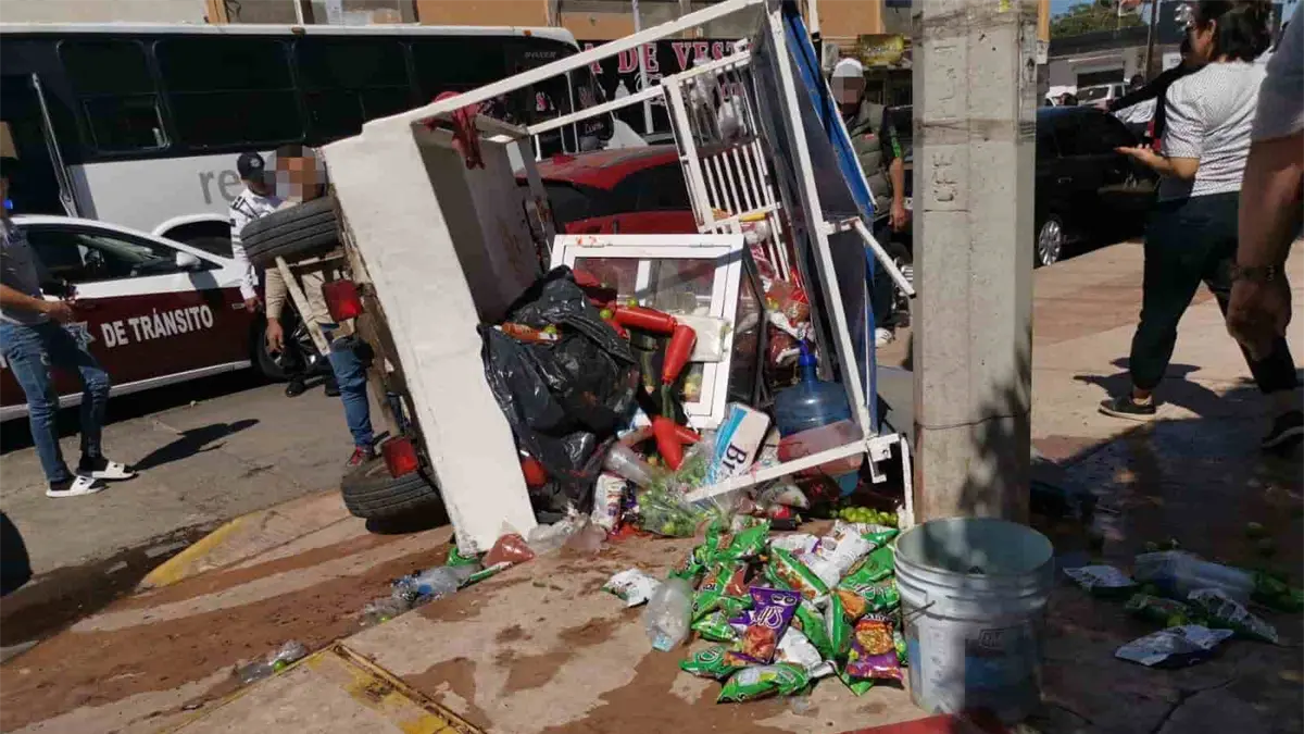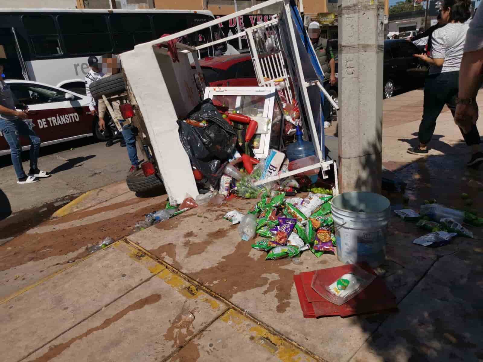 El accidente provocó que la carreta terminara volcada, mientras que la fruta y las frituras que vende quedaron derramadas sobre la banqueta.