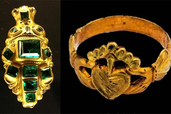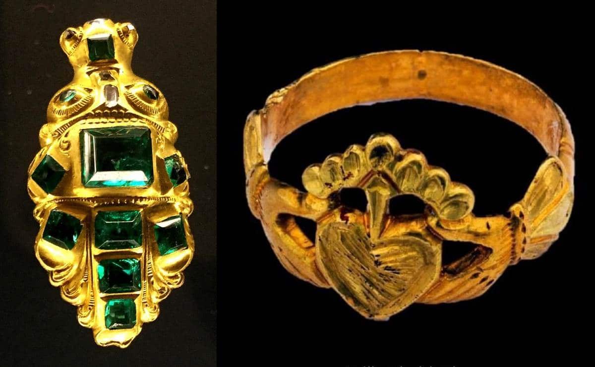 Además de las piezas de oro, diversas gemas preciosas y piezas de joyería, también se encontraron piezas de numismática, como monedas de plata y elementos de la vida cotidiana, como hebillas, cañones y anclas.