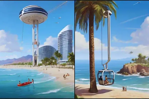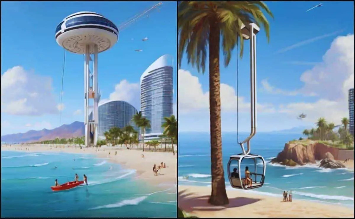 Otra de las imágenes hechas con IA muestran una gran torre en la orilla del mar, donde se puede apreciar que será una de las estaciones de este teleférico del futuro.