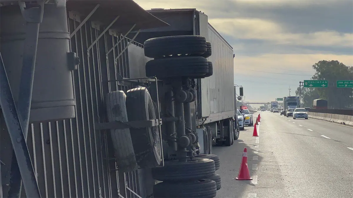 Un tráiler cargado con 22 toneladas de aguacate terminó volcado esta mañana sobre la carretera Internacional México 15, en los límites del municipio de Guasave y Ahome, presuntamente al maniobrar para evitar impactarse contra un vehículo que se le metió al paso.