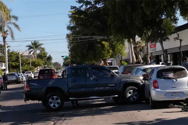 Un aparatoso accidente terminó en volcadura y carambola dejó como saldo importantes pérdidas en daños materiales en cuatro vehículos, además a una persona lesionada; el choque fue provocado por una mujer que se pasó un alto obligatorio en transitado crucero de la ciudad de Los Mochis.