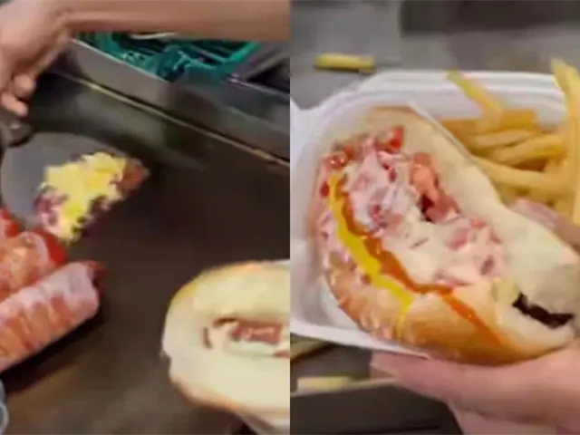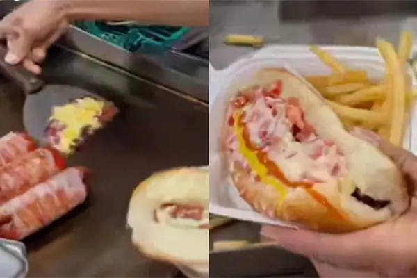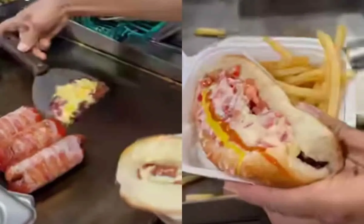 Un video se ha vuelto viral donde se muestra como hacen un perrito caliente en el norte de México con chorizo y queso gratinado encima