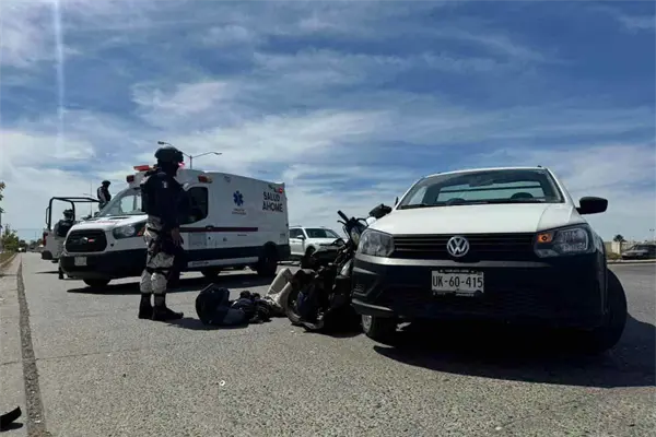 Un joven motociclista resultó con lesiones en distintas partes del cuerpo y fue trasladado a un hospital al protagonizar un accidente contra una camioneta en transitado crucero de la ciudad de Los Mochis.