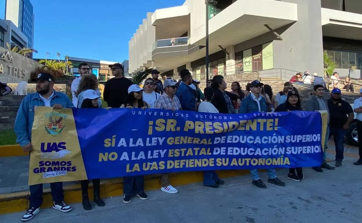 Decenas de personas vinculadas a la Universidad Autónoma de Sinaloa (UAS) se han congregado sobre la Avenida Camarón Sábalo, frente al hotel el CID en Mazatlán, para protestar ante la presencia del Presidente de la República, Andrés Manuel López Obrador.