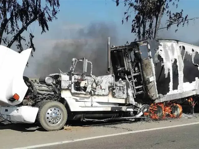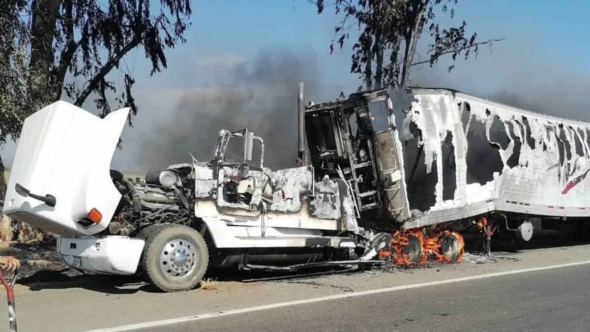 Un tráilerquedó destruido al incendiarse por La Maxipista a la altura de la Laguna de Canachi de la sindicatura de Baila de Culiacán.