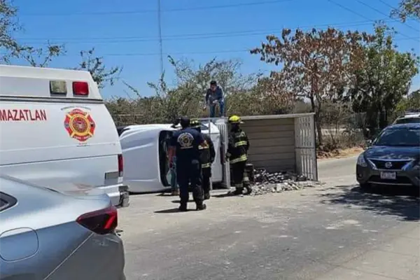 Por esquivar a perro, camioneta termina volcada en Hacienda del Seminario en Mazatlán