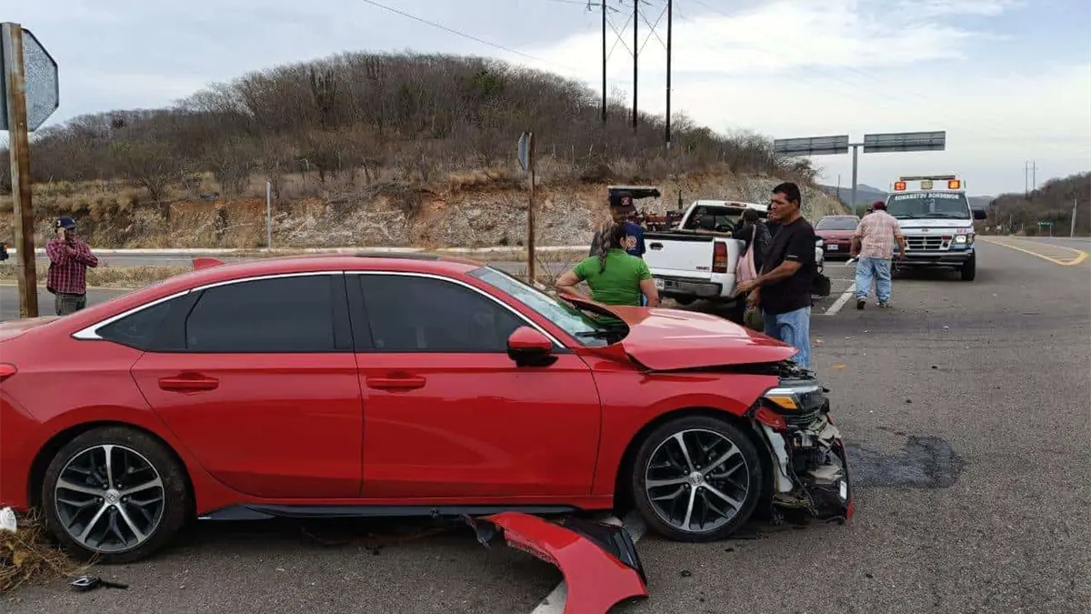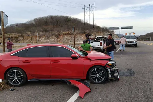Un fuerte encontronazo entre 2 unidades, una de ellas una camioneta en color blanca y el otro un vehículo en color rojo, se vivió esta mañana en el entronque que conduce a la comunidad de El Quelite.