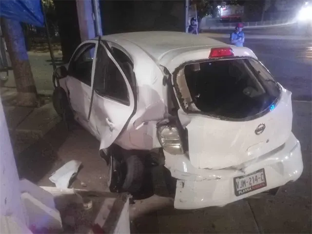 Al finalizar el puente se estrellaron contra una camioneta Chevrolet Equinox verde y posteriormente se estrellaron contra un poste de acero que se encuentra en el estacionamiento de una farmacia.