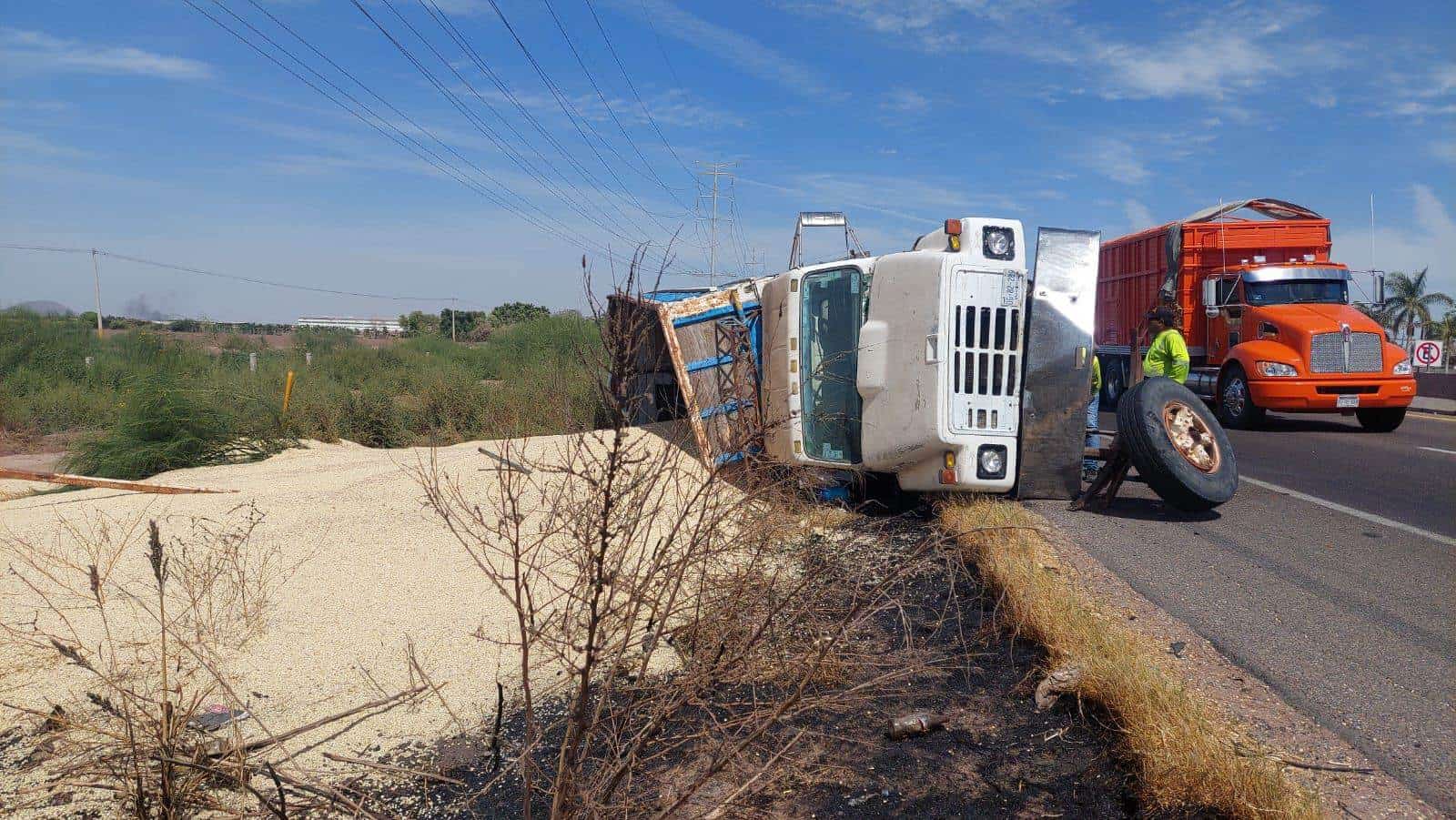 Un camión tipo torton cargado con 25 toneladas de maíz blanco, volcó y derramó el grano en el acotamiento de la carretera internacional México 15, al sur de la ciudad de Los Mochis, en las inmediaciones de la Zona Industrial; trascendió que momentos antes se había presentado otro accidente de una motocicleta.