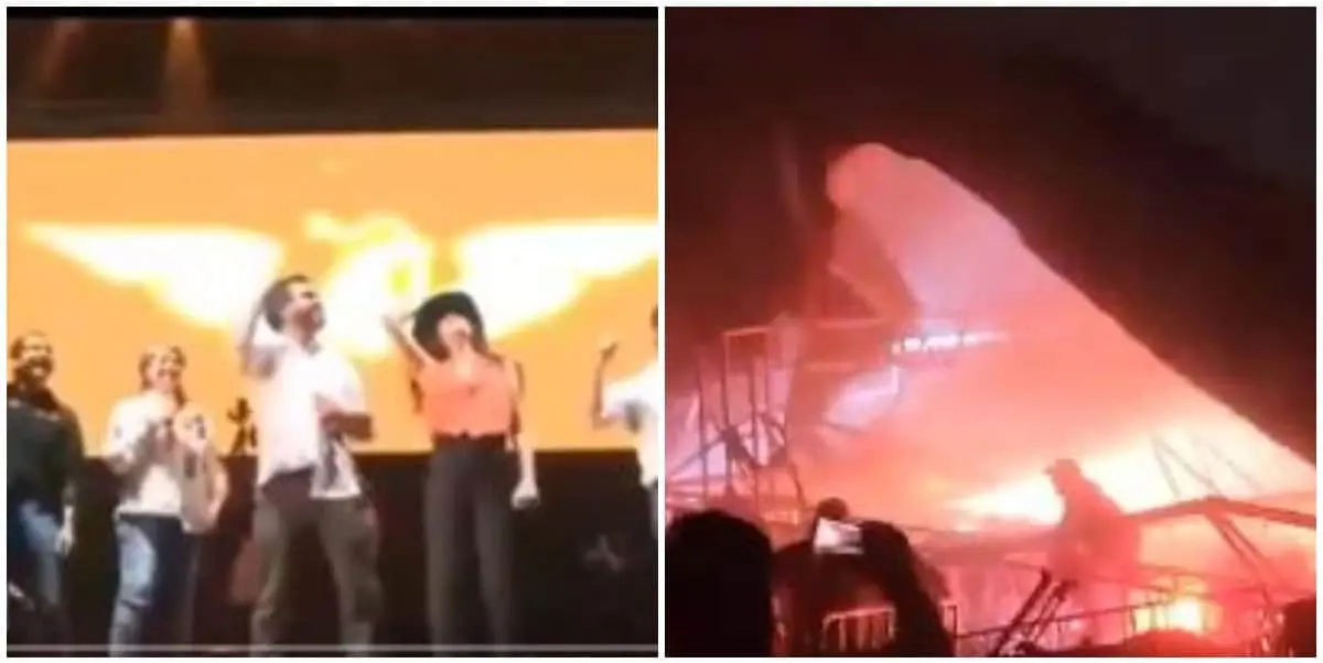 En varios videos que se viralizaron en redes sociales se aprecia cómo el candidato presidencial, Lorenia Canavati y militantes de MC corrieron para bajar del escenario mientras la estructura donde se mostraba el logo del partido caía.