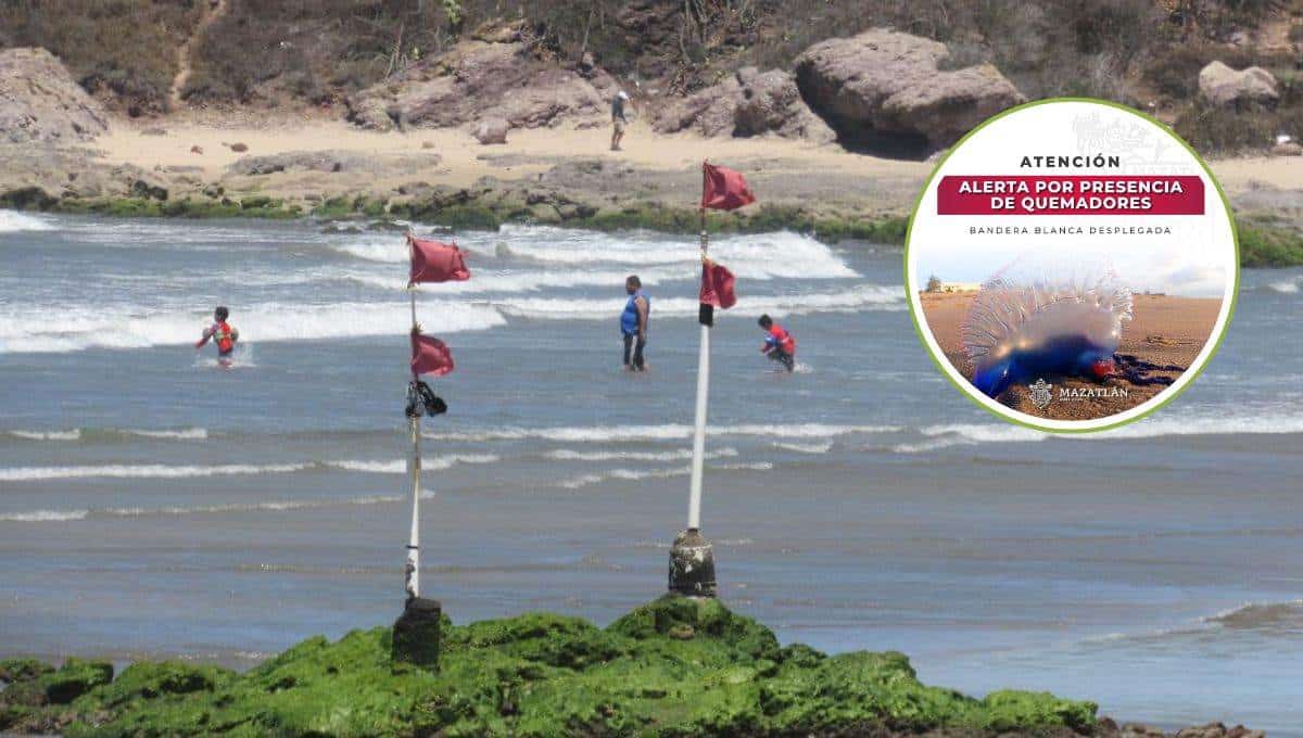 Alto oleaje por efectos de Mar de Fondo y la presencia de quemadores o «aguamala» se registra en las playas de Mazatlán.