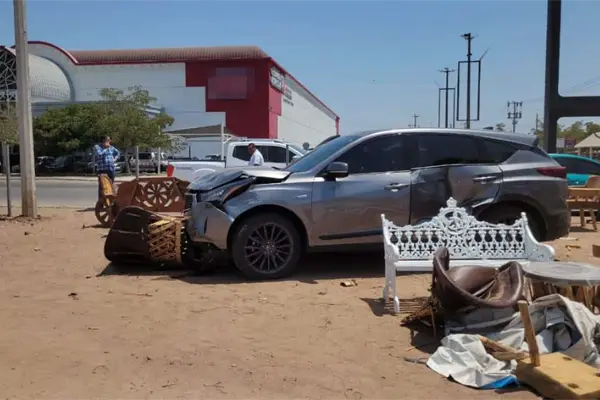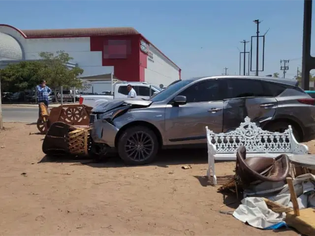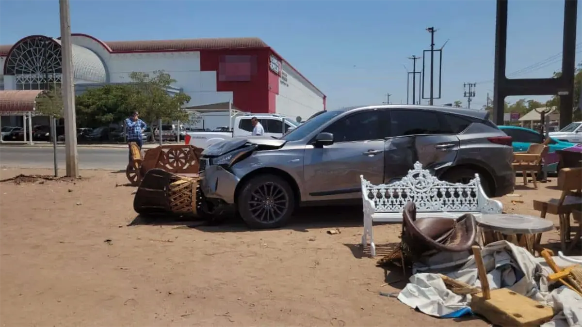 El choque provocó que ambos vehículos se salieran de la rúa asfáltica, la camioneta Acura, que circulaba a mayor velocidad, se subió a un lote baldío ubicado en ese cruce y causó daños a un negocio ambulante de venta de muebles de madera, afortunadamente, la conductora resultó ilesa.