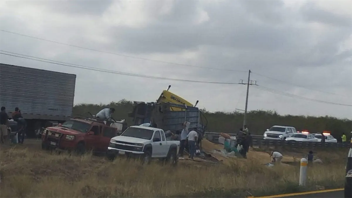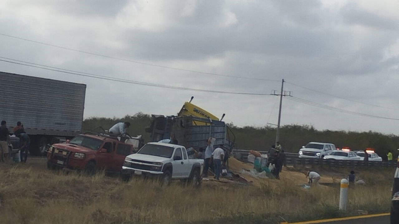 Un camión cargado con granos, terminó volteado sobre la Maxipista a la altura de la Cruz de Elota.