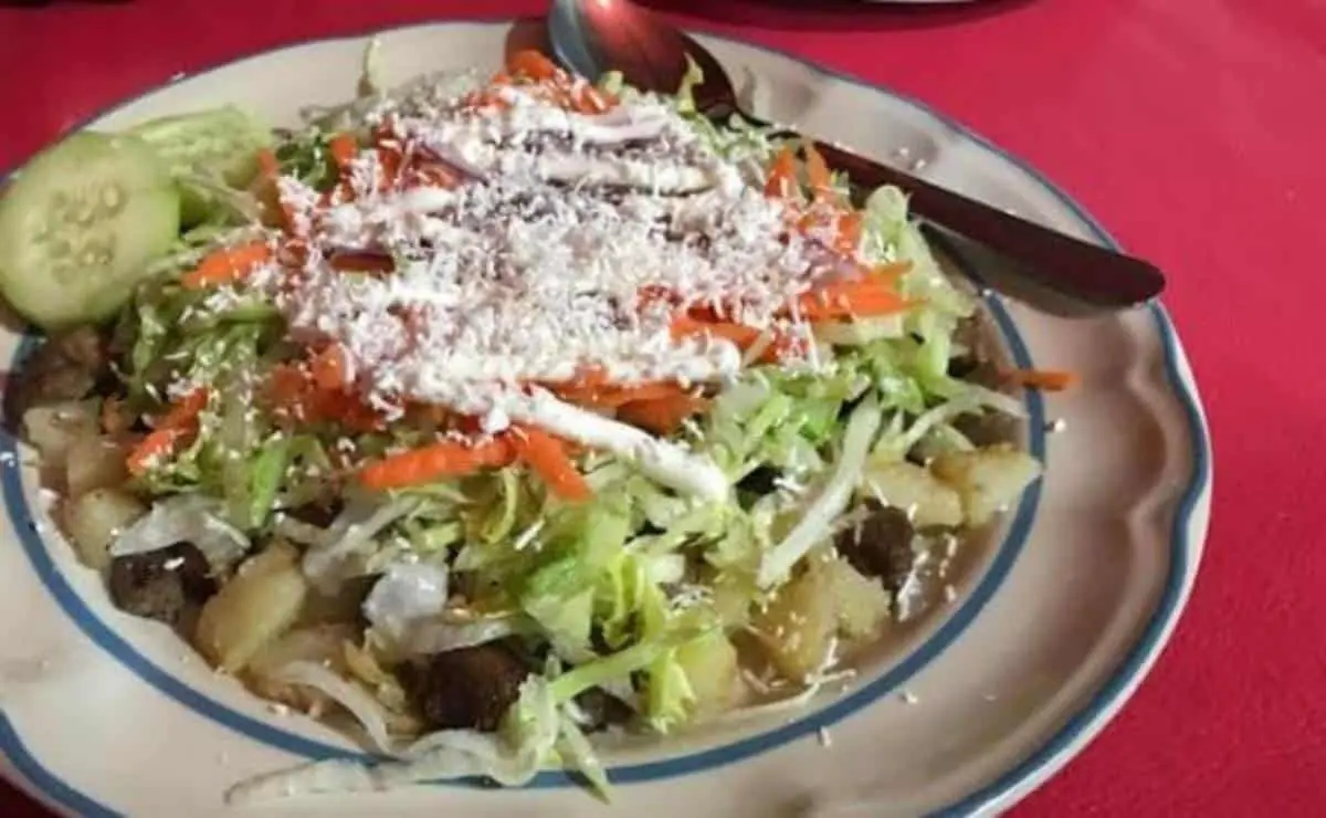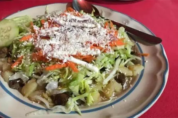 Este platillo típico consta de una base de carne de res frita con trocitos de papa, a la que se le añade una sabrosa salsa de tomate y una mezcla de verduras frescas.