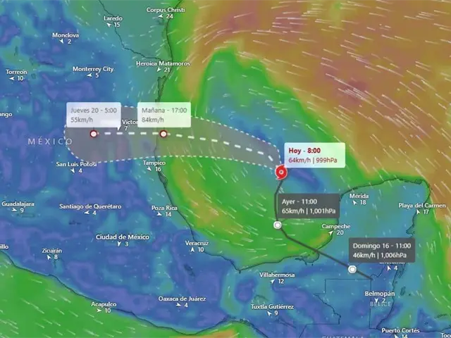 • Cerca de las 12:00 horas de ese día, se prevé que se degrade a depresión tropical sobre tierra, a 40 kilómetros al noreste de Ciudad Victoria.